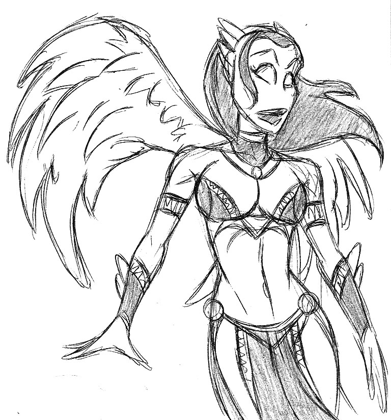 Ok, so HERE is that picture I was talking about. This is an early concept sketch of the Air Spirit Avia. I think she still needs a little bit of work, but it's a step in the right direction. I want her to look like some sort of winged elf person. That just seems to be a cool look for her.